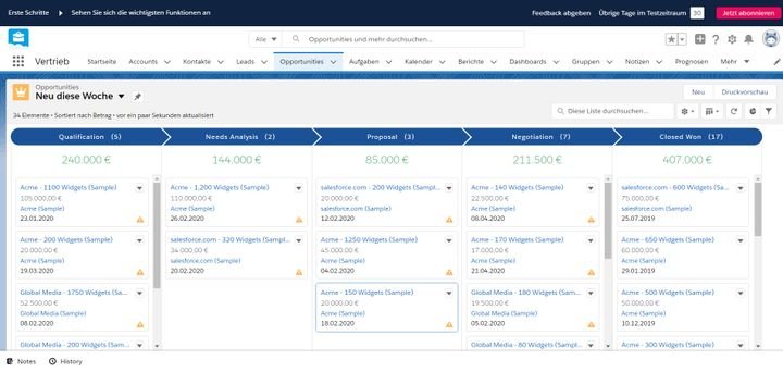Das sind die Schlüsselfunktionen der Plattform: Salesforce bietet eine Kontakte-Management-Funktion, sodass der Status jedes Geschäfts einfach zu verfolgen ist. Beim Anlegen eines Kontakte generiert das System außerdem automatisch eine Aufgabe, die Sie an den individuellen Workflows anpassen können. Die Suite ermöglicht das Verwalten von Verkaufschancen vom Anfragen bis zum Auftrag, das Verfolgen von Phasen und Marketingkampagnen sowie das Überprüfen relevanter Erkenntnisse für flexible und gezielte Reaktionen.